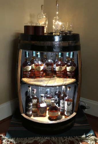 Our whiskey barrel cabinet is made from an authentic bourbon barrel from a local distillery cut open to display your collection of alcohol or to use as a home bar. Bottom lid is flipped so the non-charred side is in the inside of the barrel.  Rings are secured with several screws to keep the barrel from getting loose as it dries out in your home.  We paint the rings black.