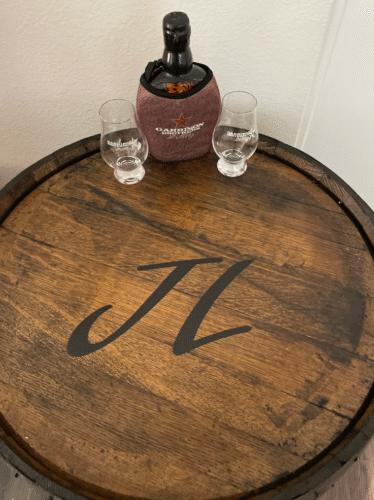 nThe top lid of the barrel can also be customized if you’d like for a minimum of $50.  Before placing your order for a custom top, please email me at [email protected] to get a quote on the price.  We won’t put trademarked images, logos, or lettering on any item unless it is your business or you have authority to grant permission to place the trademarked image, logo, or lettering on the item.  We use a Cricut to cut a stencil and then paint it on with black paint before applying any stain or finish.