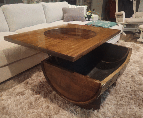 Our bourbon barrel coffee table made from bourbon barrel is probably our most unique item. The base is made from the other side of the barrel. Lift hinges raise the tabletop up 5 inches and forward 7.25 inches. Dimensions will be 40 inches long, 30 inches wide, and about 19-20 inches tall when closed. You can choose to have the top made from solid oak as well.