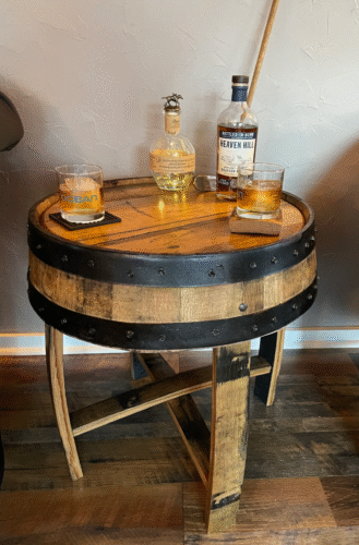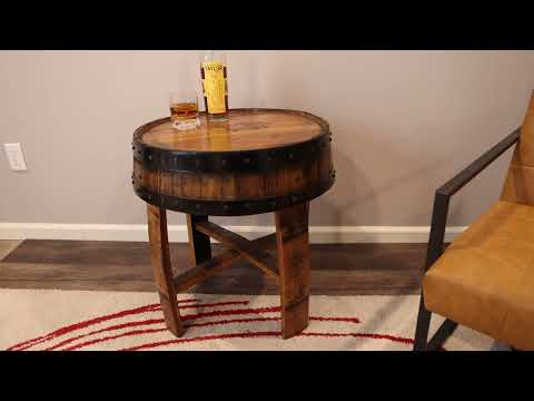 This bourbon whiskey barrel end table is a great addition to any man-cave, living room, or game room. We offer it in sizes from 20-24 inches tall and in 3 different colors (polyurethane finish with no stain added to barrel, chestnut stain with polyurethane finish, or dark walnut stain with polyurethane finish). Made from authentic bourbon whiskey barrels locally sourced from Kentucky. Diameter at the widest point is approximately 23 1/2 inches.