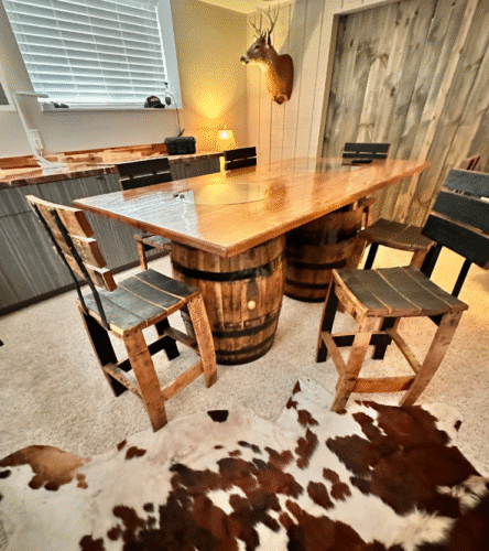 This whiskey barrel table and dining set will be a huge conversation piece in your home. We start with 2 double door cabinets built how you want them and add on a 1-inch-thick x 42″ wide, and 80″ long solid oak top.