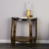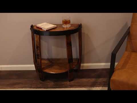 Minimal half round end table with metal accents. Uses only authentic bourbon barrel parts